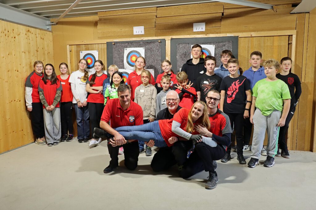 Ralf, der leitende Trainer des heutigen Tages, freute sich wieder sehr über die volle Schießlinie und die ebenfalls strahlenden Gesichter der jungen Bogenschützen.